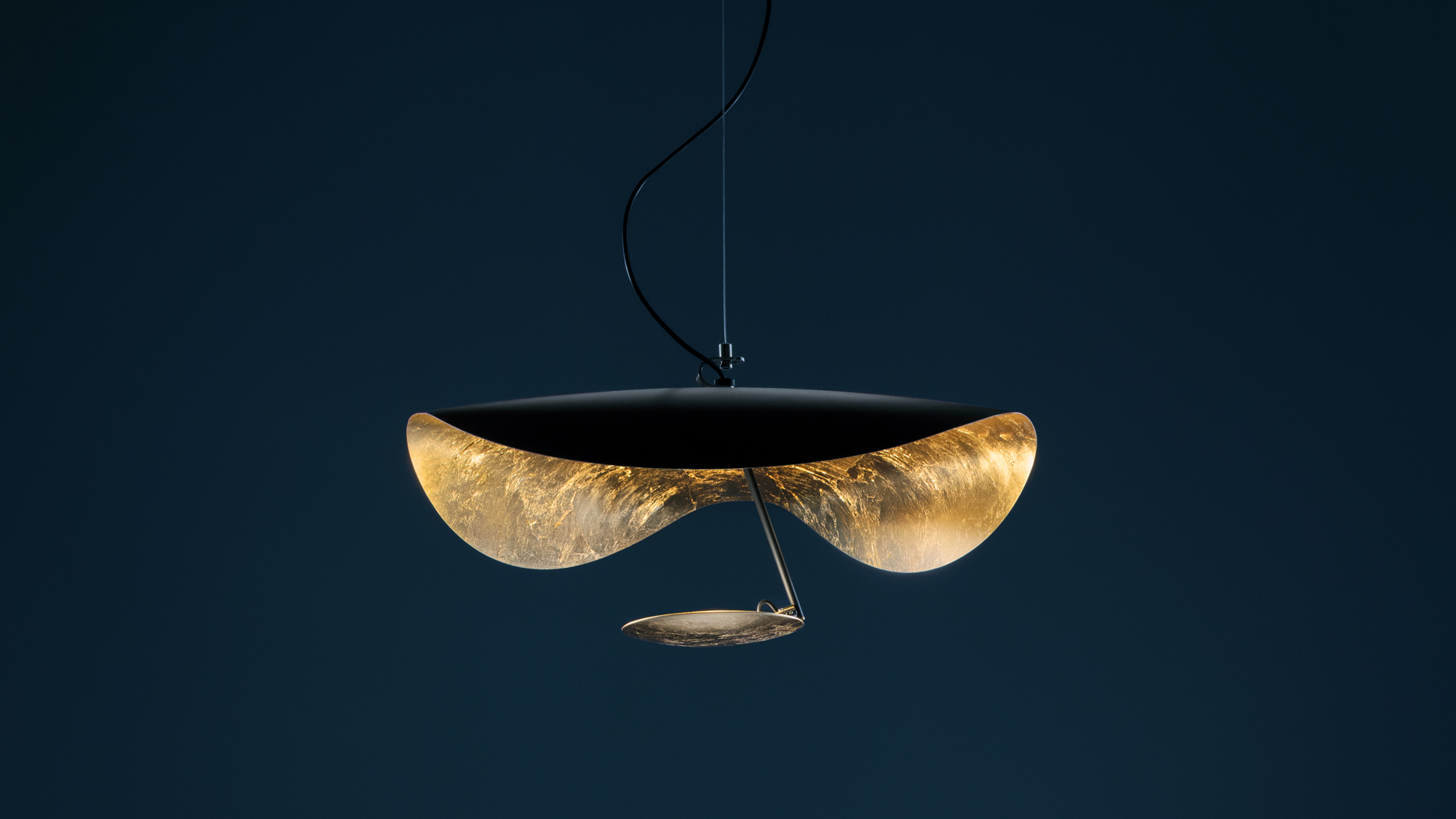 schermo nero/foglia oro / asta nera con tappino oro / disco foglia oro / base nera
